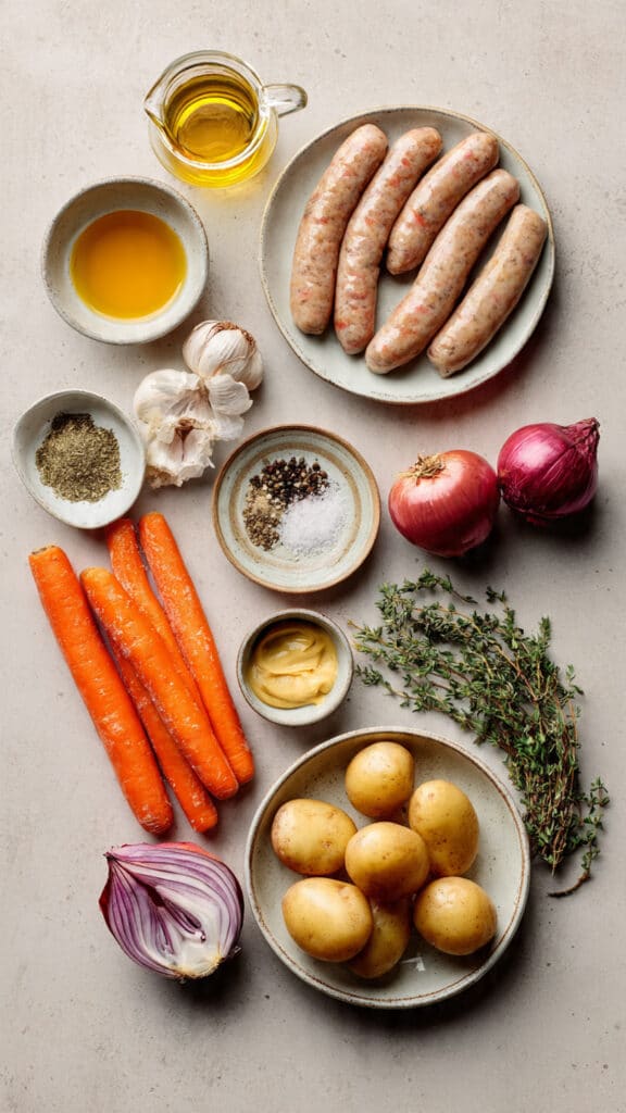 A hearty Mustard Sausage Tray Bake made with juicy pork sausages, roasted baby potatoes, tender carrots, and red onion tossed in a tangy whole grain mustard and honey glaze. Everything roasts together on one tray for a comforting and flavorful dinner.