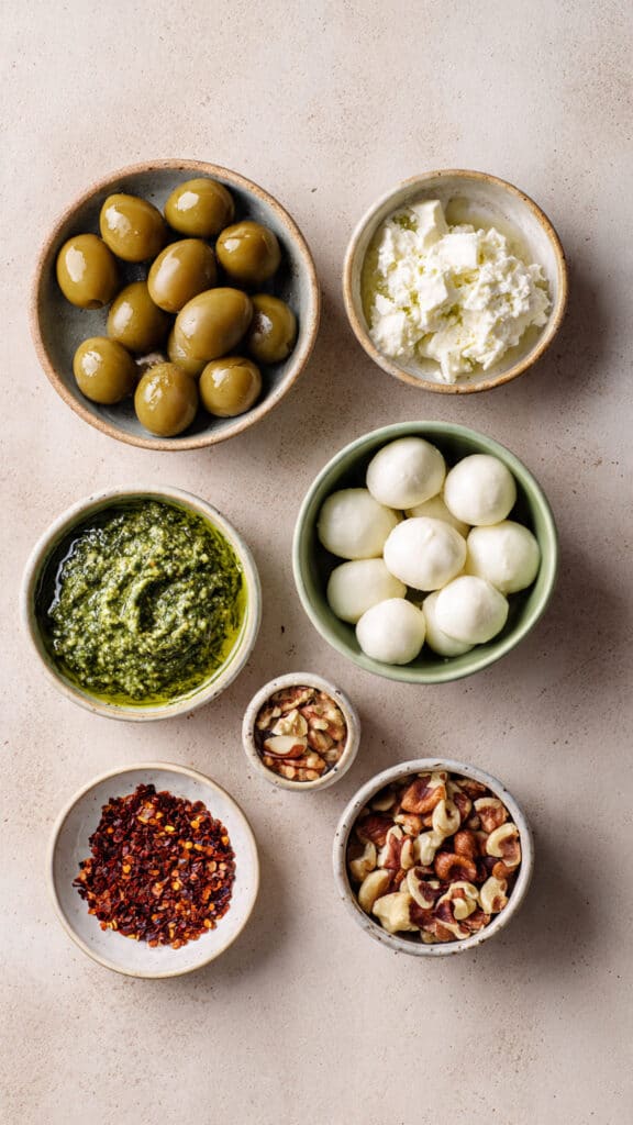 Ingredients in Olives and Mozzarella over Whipped Pesto Ricotta