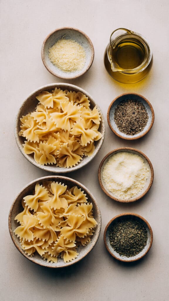 - Combine Ingredients: Boil bowtie and rigatoni pasta in salted water until al dente according to package instructions. Drain well and pat dry. Transfer to a mixing bowl and toss with olive oil, parmesan, garlic powder, oregano, basil, salt, and black pepper until evenly coated.