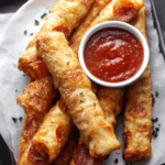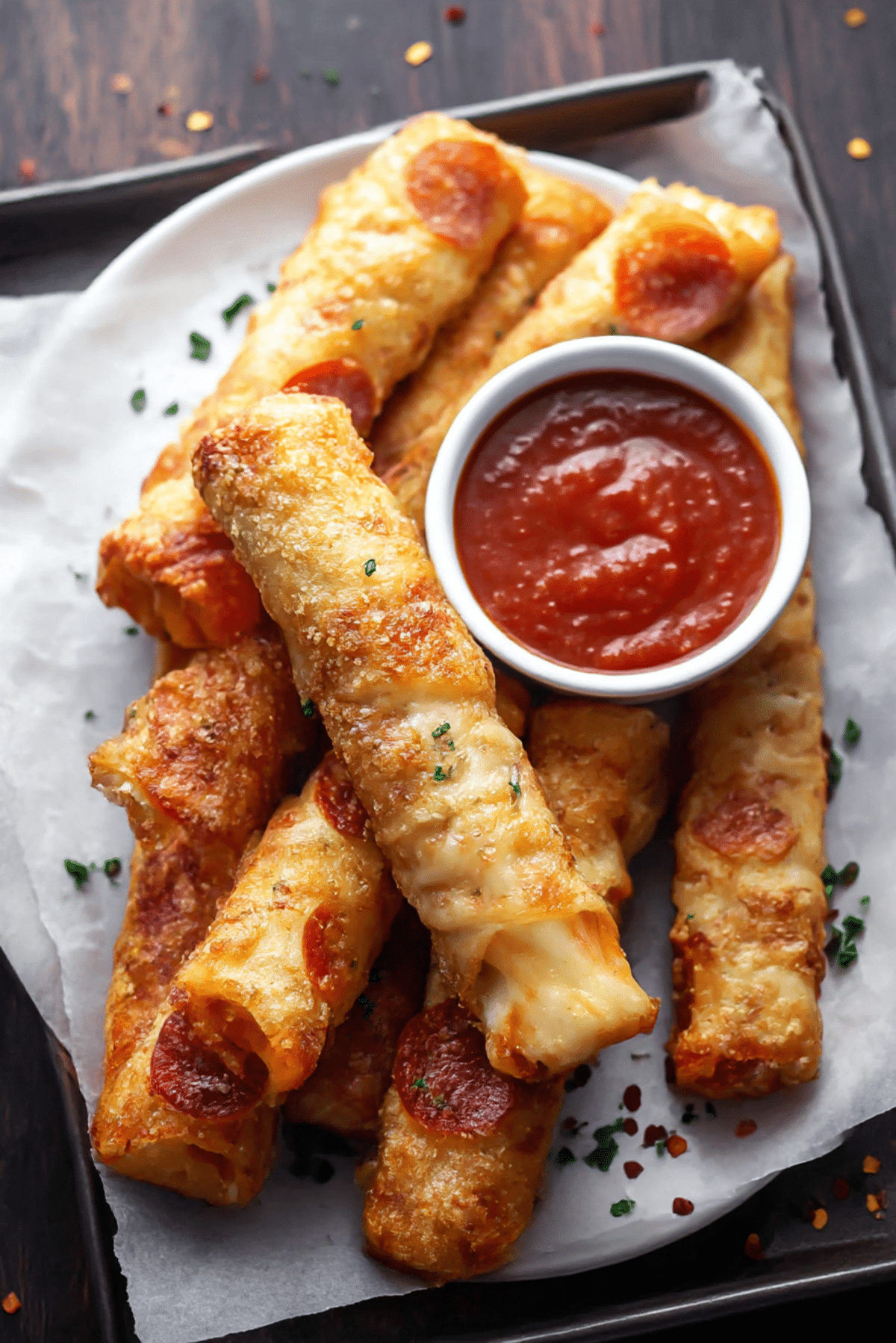 Pepperoni Pizza Mozzarella Sticks combine the best of pizza and cheesy snacks with crispy fried wrappers, gooey mozzarella centers, and spicy pepperoni in every bite.