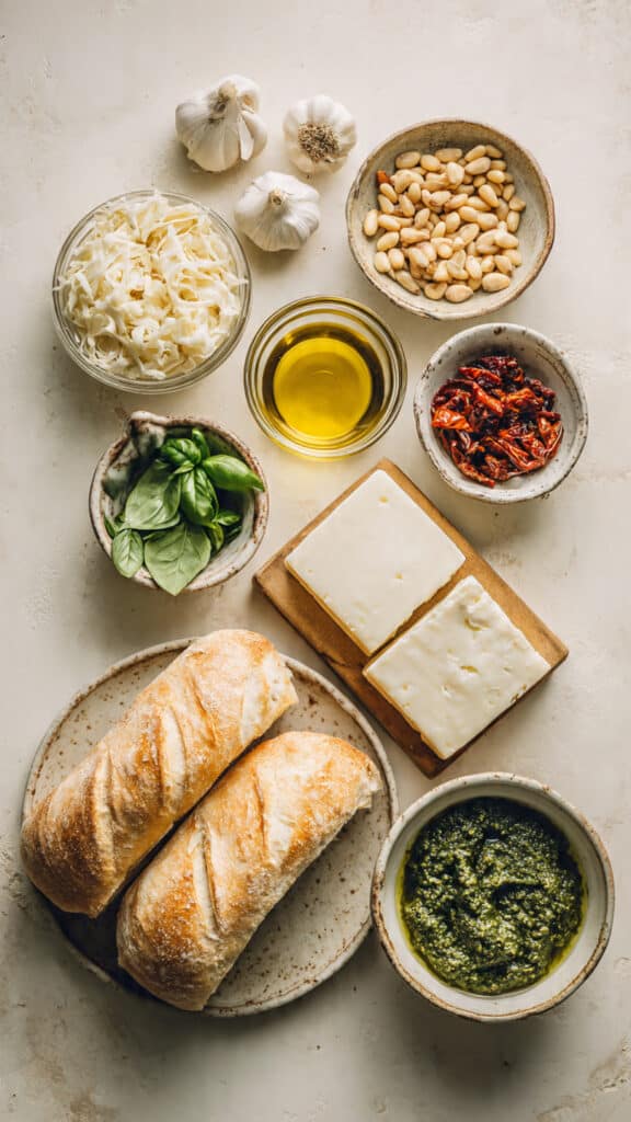 This dish is all about contrast. The molten brie is soft, creamy, and mild, while the pesto brings punchy herbaceous notes. The sun dried tomatoes add chewy sweetness, and the pine nuts give it a satisfying crunch. All of it scooped up with crispy ciabatta? Pure heaven.