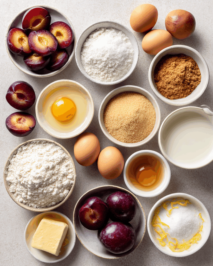 - Fresh Plums: 5–6, halved and pitted. Juicy and sweet with a slight tartness that balances the cake.