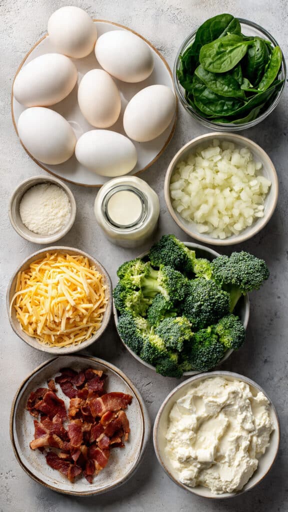 - Combine Ingredients: In a large bowl, whisk together the eggs, milk, and cottage cheese until smooth. Stir in the diced onion, chopped spinach, finely chopped broccoli, crumbled turkey bacon, shredded cheddar, garlic powder, salt, and pepper.
