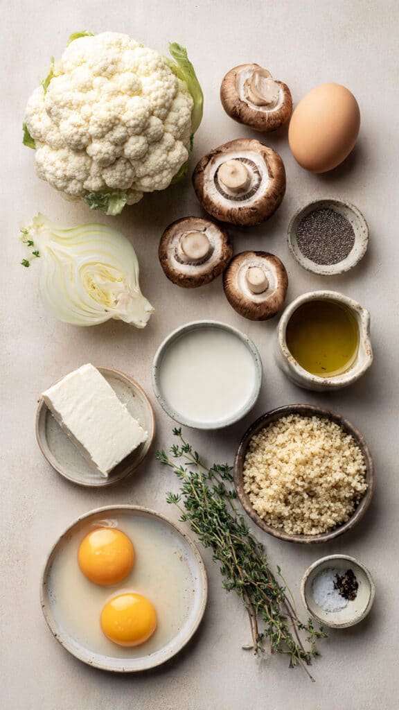 A wholesome and savory quiche featuring a nutty quinoa crust filled with roasted cauliflower, earthy mushrooms, creamy goat cheese, and fresh thyme. Perfect for brunch, lunch, or a light dinner with bold yet balanced flavors.
