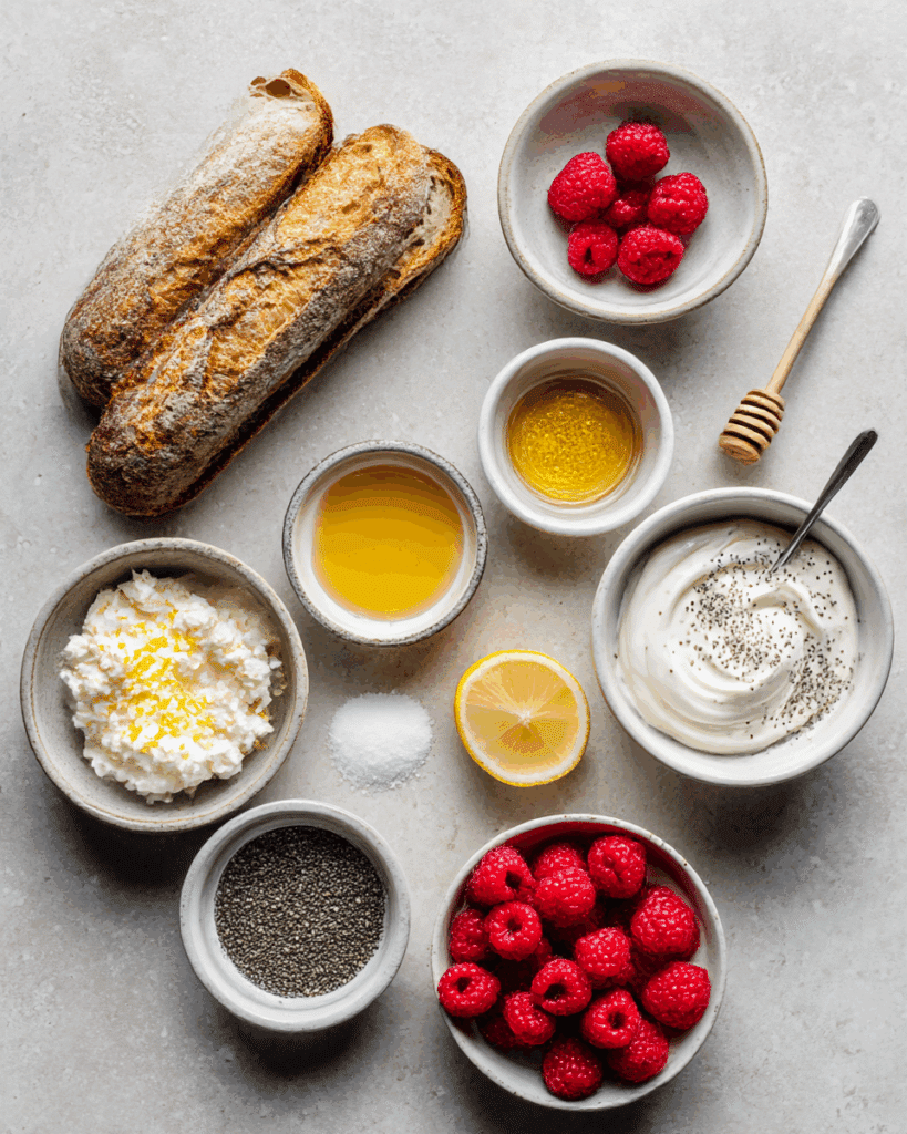 Ingredients in Sourdough with Whipped Cottage Cheese and Raspberry Chia Jam