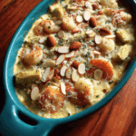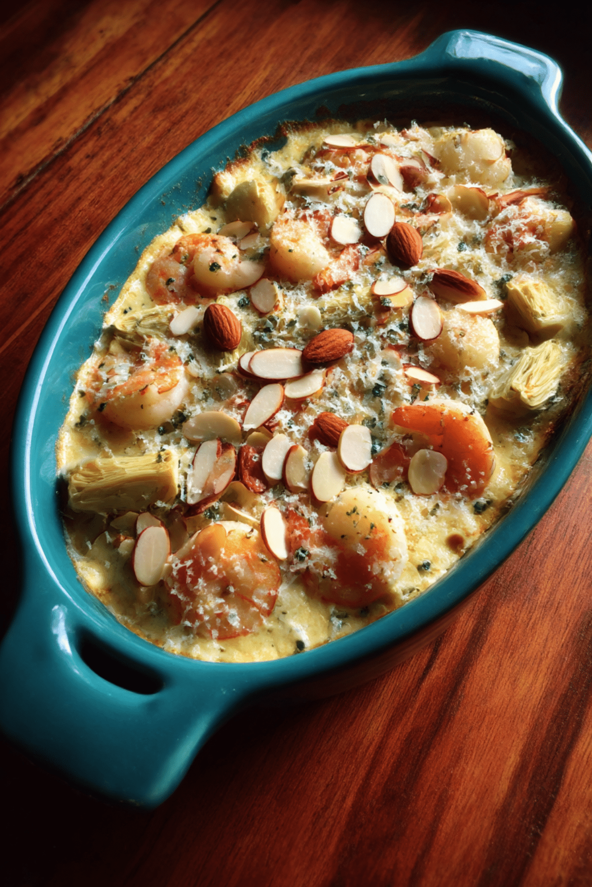 A rich and creamy seafood casserole packed with shrimp, scallops, artichokes, and a cheesy sauce, finished with crunchy sliced almonds and a golden top. This dish is elegant, comforting, and perfect for special occasions or cozy nights in.