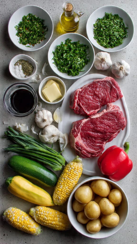 Ingredients in Steak & Potato Chimichurri with Fresh Summer Vegetables