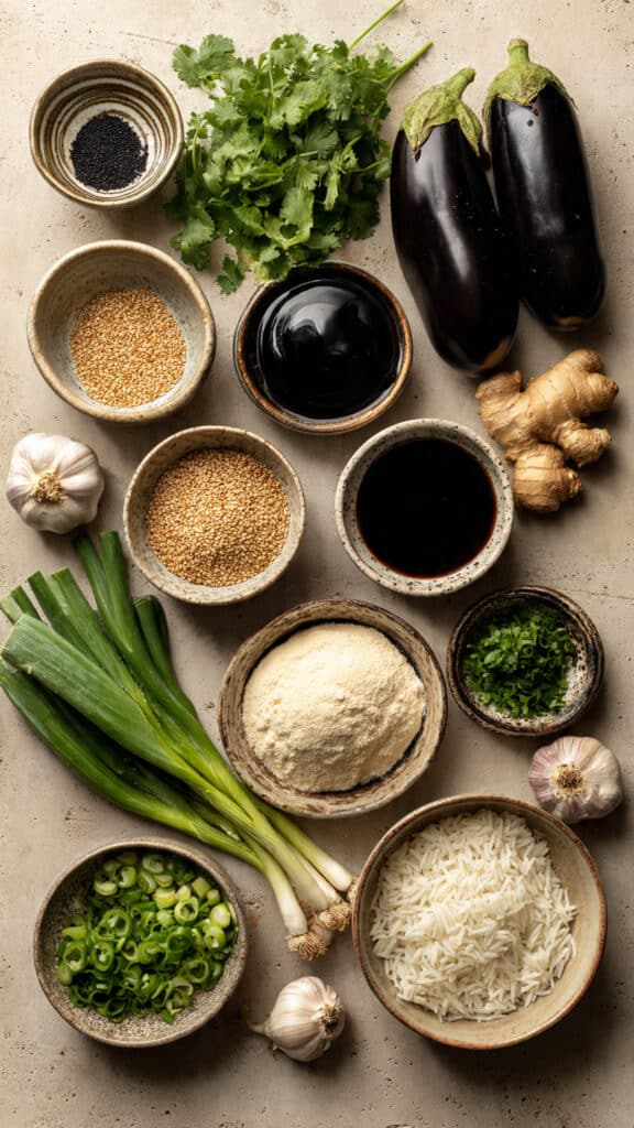 Ginger, soy sauce, and vinegar are cornerstones in many Asian inspired dishes. They create a balance of warmth, saltiness, and brightness that feels lively and satisfying. Aubergine is often used because it absorbs sauces like a sponge, transforming into something rich and deeply flavorful.