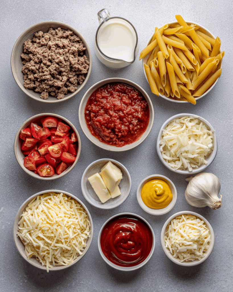 Ketchup & Mustard: It sounds odd in pasta, but trust me — it’s the secret to giving this dish its burger DNA. A little goes a long way in turning ordinary pasta into something nostalgic and crave-worthy.