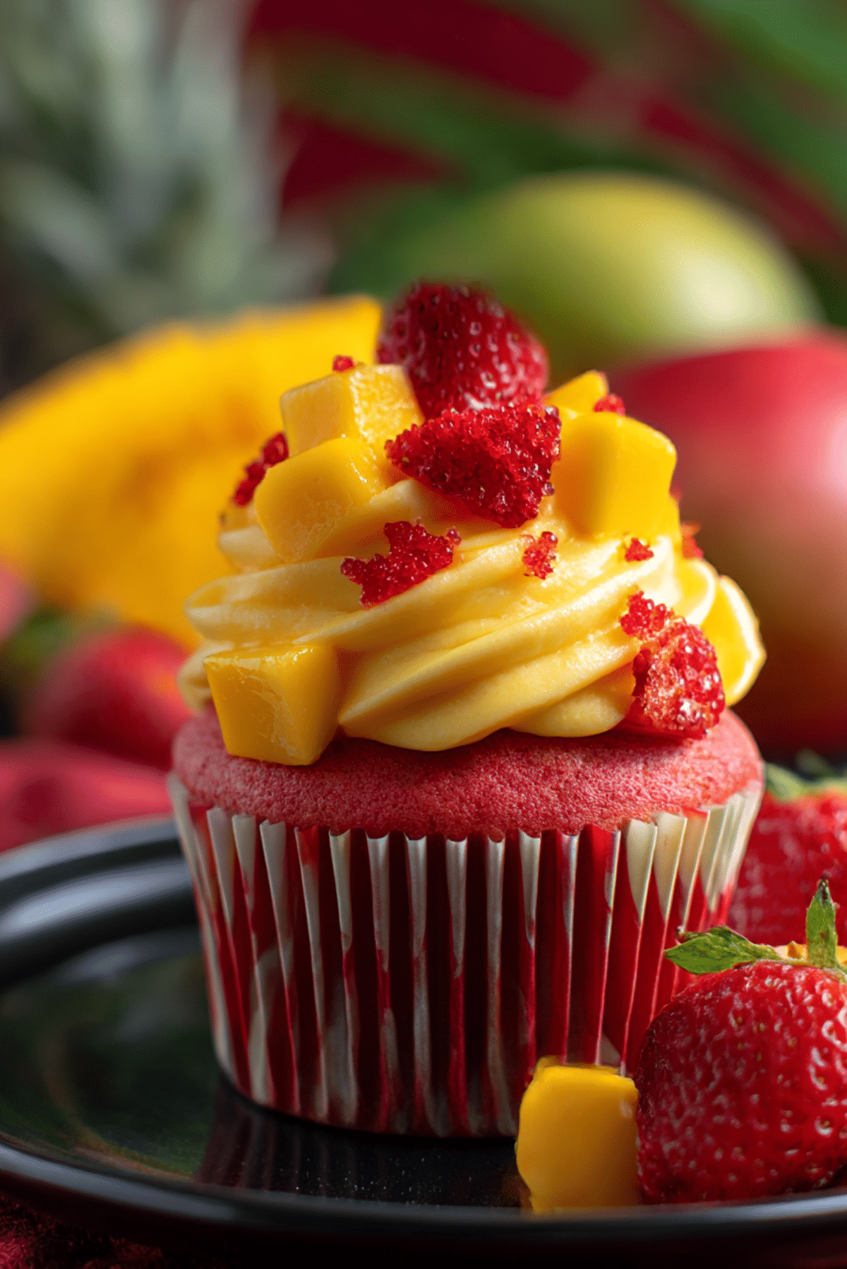 Frost generously and garnish with a halved strawberry and a mango cube on top. Use colorful cupcake liners and a bright cake stand to make them pop. For parties, arrange them in a circle with lime wedges or edible flowers between each cupcake.