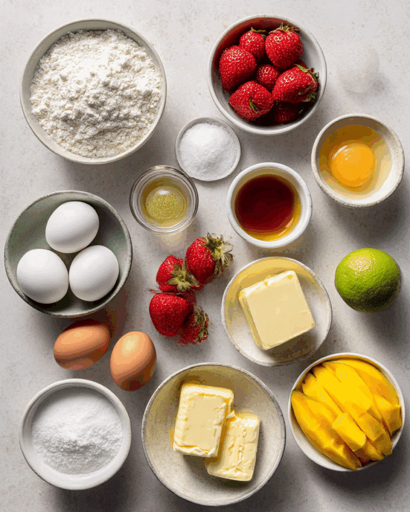 - Combine Ingredients: In one bowl, whisk flour, baking powder, and salt. In another, cream butter and sugar. Add eggs one at a time, then mix in vanilla, pureed strawberries and mango, lime zest, and milk.
