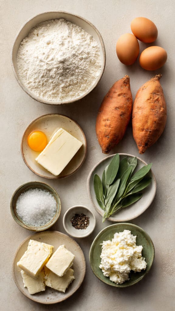 - Combine Ingredients: Roast the sweet potatoes until tender, then mash them. Mix the mashed sweet potatoes with ricotta, parmesan, half the salt, and black pepper until smooth.