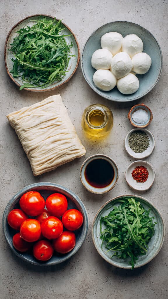 When you cut into it, you get crisp pastry layers giving way to soft, juicy tomatoes and melted cheese. The olive oil and herbs bring everything together, while the arugula adds a fresh contrast. It is rich yet balanced, warm yet bright.