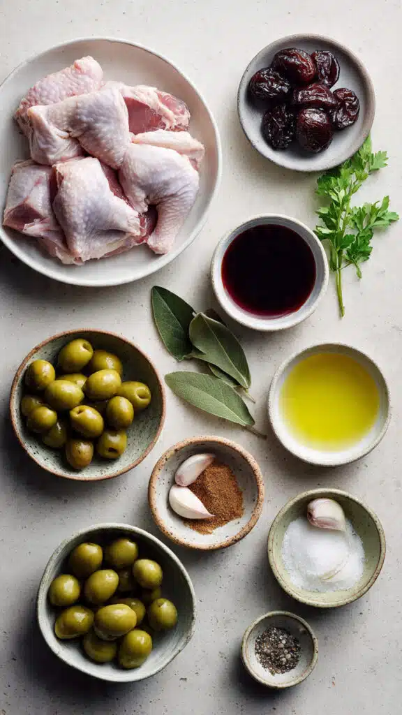 - Combine Ingredients: In a large bowl, mix olive oil, red wine vinegar, minced garlic, oregano, salt, black pepper, and bay leaves. Add chicken pieces, prunes, olives, and capers. Toss until everything is evenly coated.
