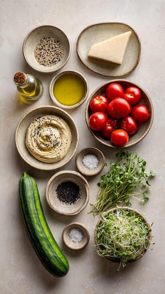 Fresh and vibrant cucumber rounds topped with creamy hummus, juicy cherry tomatoes, shaved Parmesan, delicate sprouts, and a sprinkle of sesame seeds. A crisp, no-cook appetizer that is light, colorful, and perfect for gatherings or healthy snacking.