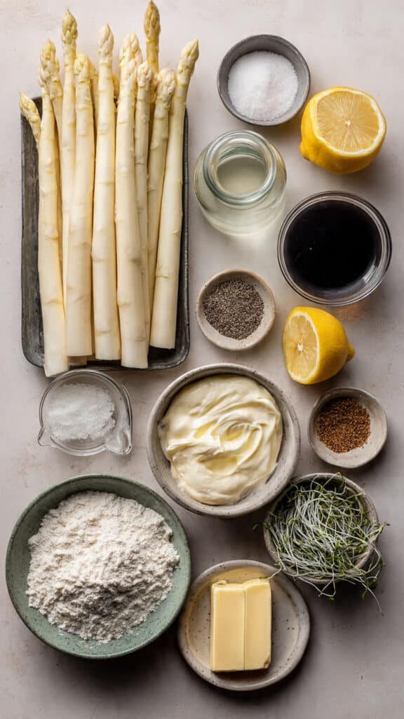 - White asparagus (or green): 20 oz (or 16 oz if using green). The star of the show — sweet, tender, and subtly earthy.